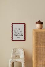 Une illustration de Moomintroll dans un champ de fleurs avec une couronne de fleurs sur sa tête. "Moomin" est écrit en dessous du motif. Le motif est illustré en noir et se détache sur un fond blanc cassé.
