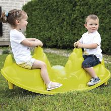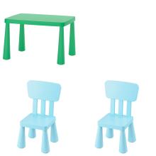 1 table rectangulaire verte et 2 chaises turquoises MAMMUT de chez Ikea pour profiter de l'extérieur.
