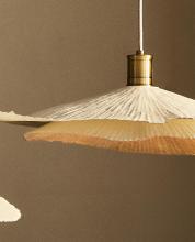Lampe suspension en papier avec double feuille de couleur écrue et détail doré.Le câble réglable mesure 106 cm et l’abat-jour mesure 62 cm d’une extrémité à l’autre.Ampoule non incluse.Ampoule recommandée : 60 W ou LED. Si le fil extérieur ou le câble de la lampe est endommagé, il devra être remplacé exclusivement par une personne qualifiée afin d’éviter tout risque. Douille : E27.