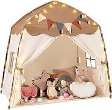 COSTWAY Tente de Jeux Enfant avec Guirlandes Lumineuses & Drapeaux, Cabane Enfant Interieure avec Fenêtres & Tissu Lavable, Style Princesse pour 3 Enfants de 3-12 Ans, 157x98x148cm (Beige + Café) : Amazon.com.be: Jouets