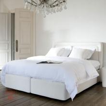 Boxspring avec tête de lit Victoria Arrondi; cette tête de lit arrondie se démarque par son liseret, réalisée à la main par Styldecor by Revor. Chez Bottz.