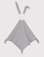 Nous avons choisi ce doudou très souple et moelleux, avec ses longues oreilles et ses nœuds aux extrémités, facile à attraper pour les petites mains de bébé.