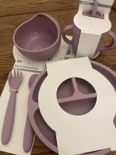 Set en silicone comprenant un bol, des couverts, une assiette à compartiments et une tasse.