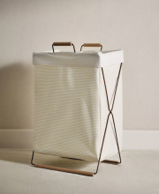 Panier à linge pliable avec structure en métal et anses en bois. Doublure en coton lavable.