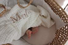 Couverture bébé en gaze de coton couleur BLANCHE. Brodée avec le prénom et son initiale fleurie.
