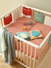 A la fois déco, confortable et anti choc, le tour de lit / tour de parc rassure les enfants en les entourant de douceur et en reproduisant le cocon de la maternité. Bébé pourra s’éveiller en toute sécurité, sans risquer de se cogner contre