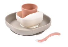 Un coffret de naissance comprenant un anneau de dentition, un hochet sur ventouse et un petit hochet.