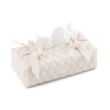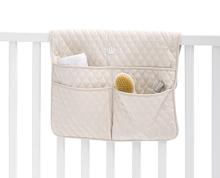 Introducing the sublime side bed care-basket from My First Collection. Designed in an elegant envelop model, this basket closes seamlessly with 4 poppers, ensuring all essentials are securely stored. With 4 compartments, it's perfect for organizing toys or pampers. Crafted from luxurious beige padded cotton, it features a regal crown embroidery.