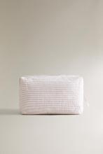 Trousse de toilette en gaze de coton pour enfant avec fermeture Éclair et imprimé rayures.