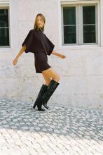 Robe courte confectionnée en tissu maille interlock élastique et souple avec une trame compacte, moelleuse et opaque. Col montant et manches courtes amples.