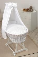 Schitterende luxe handgemaakte wieg op wieltjes. De rotan mand is netjes in de kleur wit afgewerkt en staat op een stevig onderstel. De babywieg wordt compleet uitgeleverd incl: binnenbekleding, sluier, matras en onderstel op wieltjes. De wieg is netjes afgewerkt met een romantische babystrik aan de bekleding. Het wiegje kan vastgezet worden met de rem op de wieltjes.