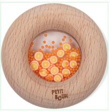 Hochet en bois en forme de beignet, idéal pour que les mains puissent le manipuler confortablement. À l'intérieur, on retrouve des formes de fruits et de légumes qui, lorsqu'on les secoue, émettent un son irrésistible.