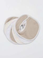 7 bavoirs couleur beige en éponge de chez Kiabi, attache avec scratch. Achetés à l'avance