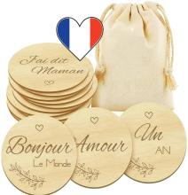 Carte Etape Bébé Bois - 30 Moments - Pochette + 15 Disques Gravés Recto Verso - Cartes Moment Nouveau Né Mois par Mois et Premiere Fois - Cadeau de Naissance et Grossesse