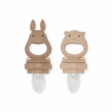 Ce set de 2 tétines grignoteuses ou sucettes d'alimentation convient aux bébés dès 4 mois. La tétine grignoteuse est idéale pour commencer la diversification alimentaire. Mettez quelques fruits mûrs et laissez votre bébé découvrir leurs saveurs en toute autonomie. L'une beige est en forme de lapin, l'autre ivoire, en forme de chat.
