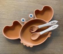 Set de repas bébé acheté sur Vinted (bavoir, bol, plusieurs couverts, gourde, assiettes)