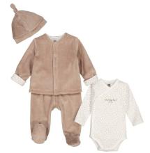Kit naissance 4 pièces composé d'une veste et d'un pantalon à pieds en velours, d'un body manches longues et d'un bonnet