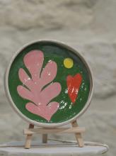 VRAI X JULIA FRECHETTE donne naissance à une série de pièces en céramique à la fois sensibles et vibrantes : tasses & soucoupes, assiettes à dessert et porte-couteaux. À partir d’un répertoire de motifs communs, Julia Fréchette compose librement, laissant sa main et sa palette tracer des variations fraîches, coloré