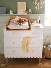 Adorable avec son fronton finement festonné, ce plan à langer se fixe facilement sur la majorité des commodes pour en faire un espace à langer pratique et esthétique