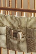 Organiseur pour lit bébé en coton avec tissu en gaze et motif à rayures. Il s'attache au lit bébé à l'aide de cordons.