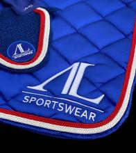 Tapis de selle satiné bleu roi avec 4 cordelettes : 2 de couleur rouge et 2 blanches, matière satinée anti-poussière très facile à entretenir. Permet une grande respiration de la peau et sèche rapidement. Pour cheval et double poney. Alexandra Ledermann Sporstwear