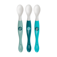 Lot de 3 cuillères Tum Tum à double embout. Étroites, fines et peu profondes elles sont idéales pour débuter la diversification alimentaire de bébé.