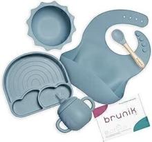 Brunik Vaisselle bébé en silicone – Comprend une assiette à ventouse avec compartiments, couverts pour enfants, cuillère en silicone pour bébé BLW, gobelet d'apprentissage, bol à ventouse et bavoir