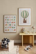 Children's poster painted in aquarelle with a motif of three animal friends on an adventure in a hot air balloon. The Green Balloon Ride Poster has a built-in white border that frames the motif elegantly.