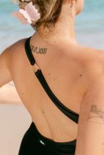 Maillot de bain une pièce imaginé asymétrique avec sa pointe d’originalité. COULEUR : noir nacré ❤️ Le détail coup de cœur de la team : son bijou doré! On te conseille de prendre la taille au-dessus.