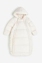 Combinaison en tissu matelassé. Modèle à capuche avec deux fermetures à glissière dissimulées devant. Manches longues terminées par moufles anti-griffures repliables. Doublure en polaire.
