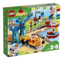 La boîte 10875 de LEGO DUPLO comprend 105 pièces, 2 figurines (1 conducteur de train, 1 capitaine et 1 vendeur), 1 mouette, 24 rails, 2 camions de marchandises à bascule, 1 bayeau ainsi que des accessoires comme 1 pompe à essence, 1 machine à café, 1 tasse, 1 barre de chocolat, 1 bouteille de lait, 1 filet de pêche, du pain, des bananes, 1 colis, 1 caisse enregistreuse, 1 clé anglaise, 1 poisson et 1 menu.