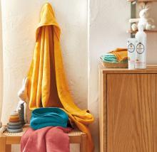 Les bébés sont frileux. À la sortie du bain, il faut être rapide pour les sécher. Notre cape de bain en microfibre éponge, elle a un vrai super pouvoir absorbant : elle est capable de boire jusqu’à 7 fois son poids en eau. Et un bébé vite au sec, c'est un bébé heureux.