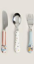 Ensemble de couverts en acier inoxydable pour enfant avec manches ornés de personnages de Mickey Mouse.