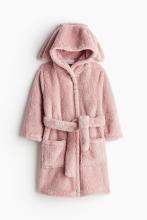 Peignoir en tissu polaire doux. Modèle à manches longues avec capuche à oreilles, ceinture à nouer à la taille et poches devant.