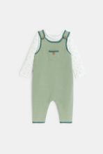 Salopette verte à jambes longues en maille tricot, avec pressions aux bretelles et à l'entrejambe, et body manches longues à fermeture croisée par pressions.