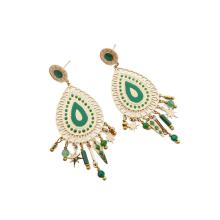 Boucles d'oreilles en acier doré composées d'une grand pendentif ovale ajouré et décoré de motifs et de pampilles vertes.