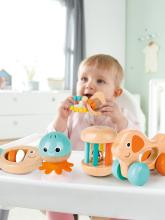 Découvrez le coffret sensoriel multi-étapes de Hape, un ensemble de 5 pièces en bois pour aider votre bébé à grandir et à s'éveiller dès la naissance.