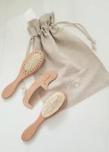 Brosse et peigne enfant personnalisé en bois gravé.Offrez vous ce jolie kit de 3 produits : brosse à cheveux, peigne et brosse à poils en bois naturel personnalisée pour bébé.Vendu avec pochon personnaliséIdéal pour un cadeau bébé et nouveaux nés original.Si vous souhaitez inscrire autre chose que le prénom de l’enfant n’hésitez pas à me contacter.Les 2 brosses mesurent 17 cm de hauteur et le peigne 12 cm.Fait main en France Pour toutes demandes sur mesure contactez-nous.