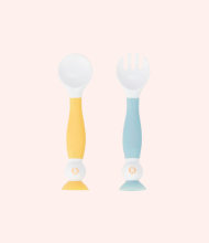 Couverts ergonomiques pour apprendre à manger seul ! 2 couverts : une cuillère et une fourchette. Se courbent à plus de 90° dans les deux sens. Manche long de 7cm. Effet ventouse. Pratiques, elles passent au lave-vaisselle.