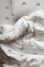 Een eenpersoonsdekbedset van geweven katoen met een geprint dessin. Eén kussensloop met een opening met een overslag.
