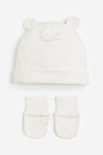 Coffret de naissance composé d'un bonnet et d'une paire de moufles anti-griffures assorties en jersey de coton très doux. Bonnet avec bord replié. Moufles sans pouces avec poignets souples et côtelés.