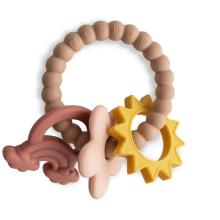 La surface en relief des feuilles de l'anneau apaise doucement les gencives douloureuses des petits qui font leurs dents, tandis que trois breloques terreuses éveillent les sens.