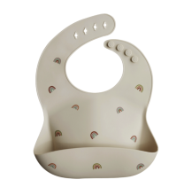 Fini de se salir les vêtements grâce à ce bavoir avec bac récolteur de Mushie. Super sympa avec les petits arcs-en-ciel !