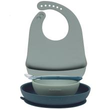 Il est composé d’une assiette et d’un bol avec ventouse, d’un bavoir et d’une cuillère.