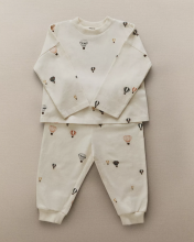 Ensemble de pyjama pour enfant en jersey de coton, composé d'un pantalon long à taille réglable et d'un T-shirt à manches longues et à col rond, tous deux avec un motif de montgolfières.