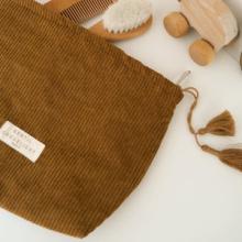 Jolie trousse en velours côtelé. Cette trousse de toilette en velours côtelé sera parfaite pour ranger le nécessaire pour la toilette ou le change de bébé.