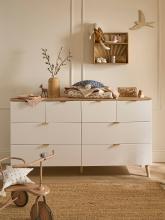 Esprit authentique et épuré pour cette commode double tendance qui allie le bois et des poignées dorées. Grâce à ses 8 tiroirs, vous pouvez ranger de nombreux vêtements et jouets dans la chambre de