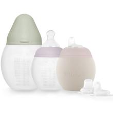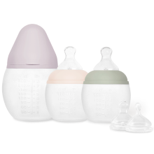 The Élhée evolving set is made up of 2 baby bottles and a training bottle in unbreakable medical silicone. It also contains a set of 2 leak-proof suction nozzles that fit on baby bottles as well as the training cup. It accompanies babies from 2 months and throughout their growth.