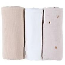 Le set de 3 langes 70x70cm mousseline - Bali, Moka & Snow de Noukies allie des matériaux doux, une grande polyvalence et un design charmant.