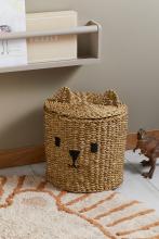 Panier cylindrique en jonc de mer tressé avec motif brodé. Modèle assorti d’un couvercle avec poignée en forme d’oreilles sur le dessus. Diamètre 23,5 cm environ, hauteur (couvercle inclus) 24,5 cm.